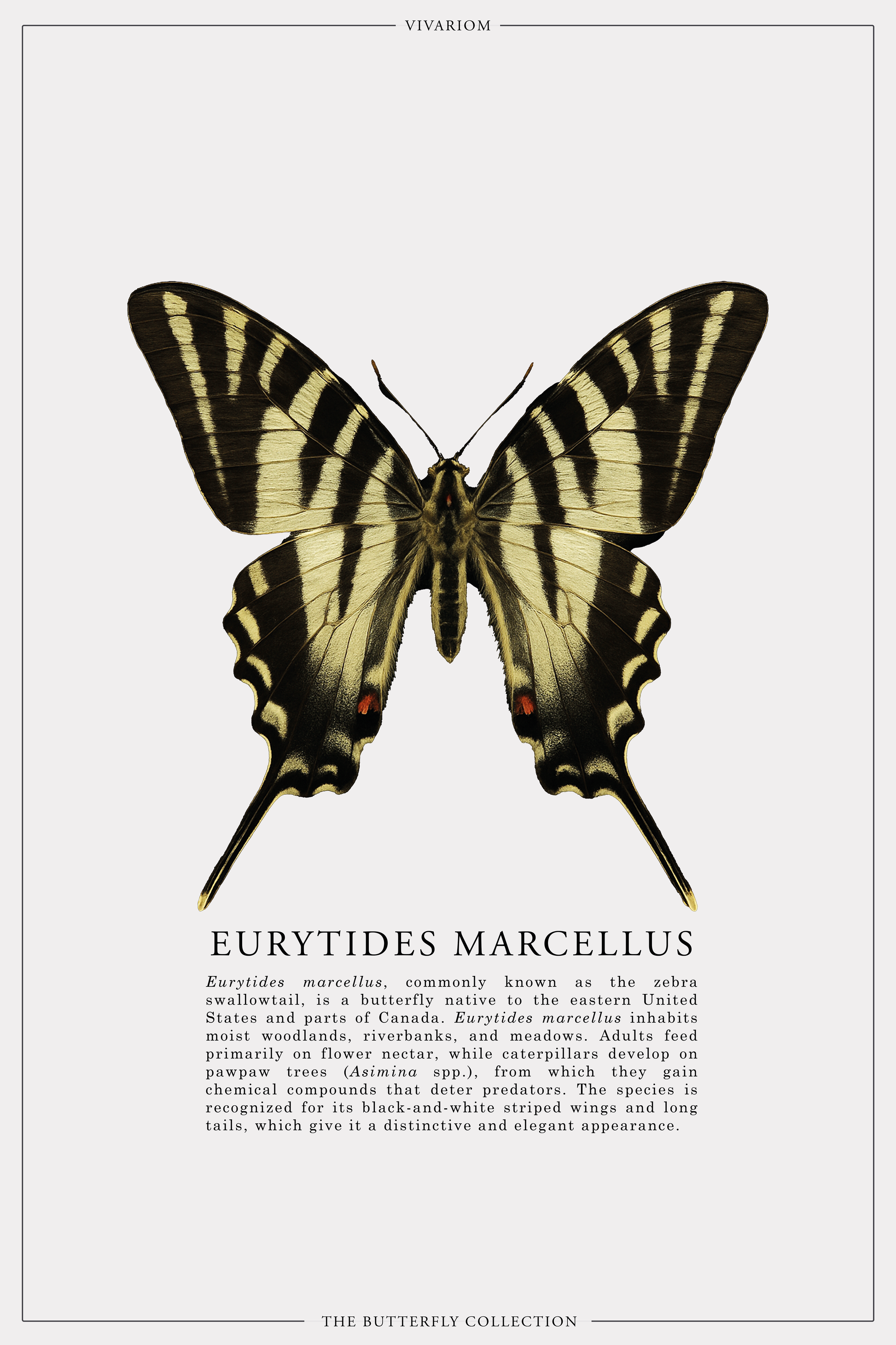 Bring the beauty of nature into your space with Vivariom’s matte art prints. This poster features the Zebra Swallowtail (Eurytides Marcellus).