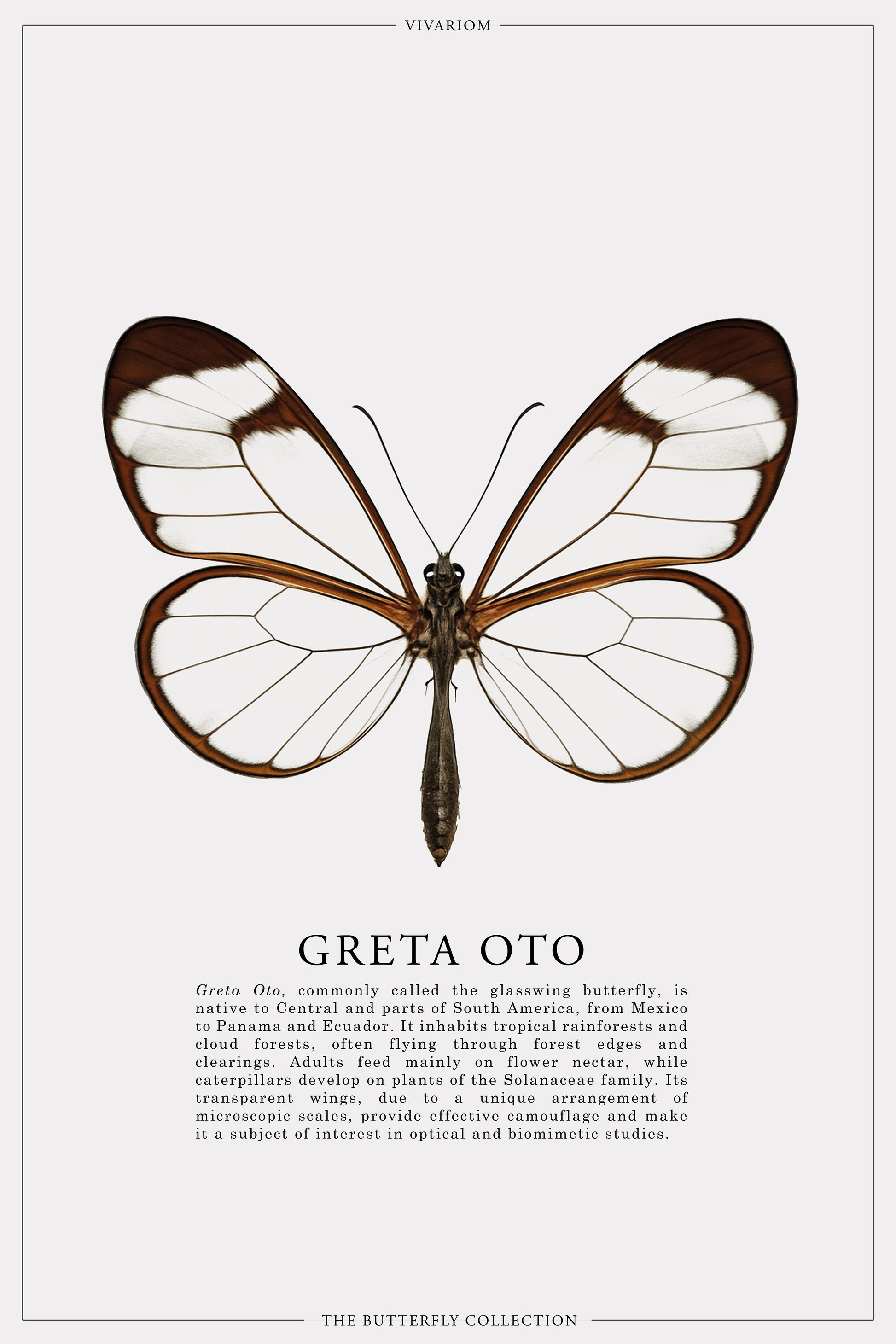 Bring the beauty of nature into your space with Vivariom’s matte art prints. This piece features the Glasswing Butterfly (Greta Oto). Perfect for nature lovers, collectors, and refined interiors.