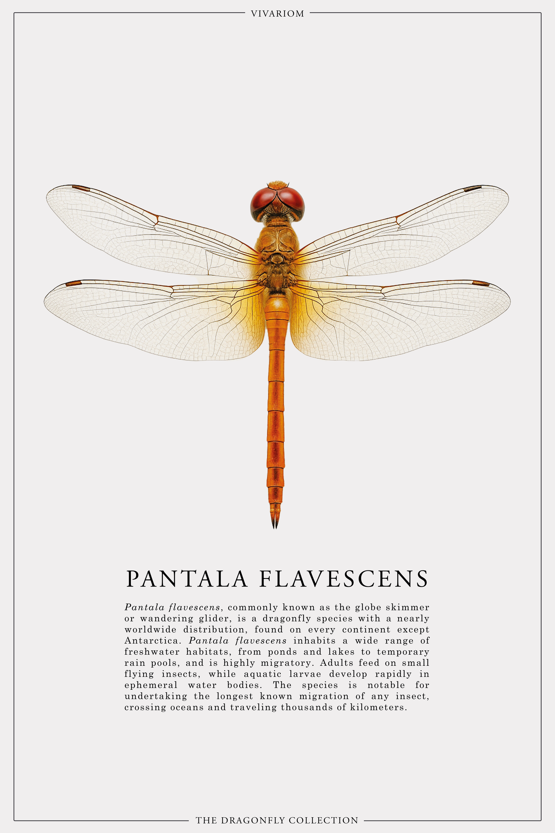 This encyclopedic matte art print presents Pantala flavescens, the Wandering Glider dragonfly, as a refined naturalist plate, capturing its golden-yellow body, broad amber-tinted wings, and graceful form in precise detail. A unique piece for nature enthusiasts, collectors of scientific illustration, and interiors seeking elegance with meaning.