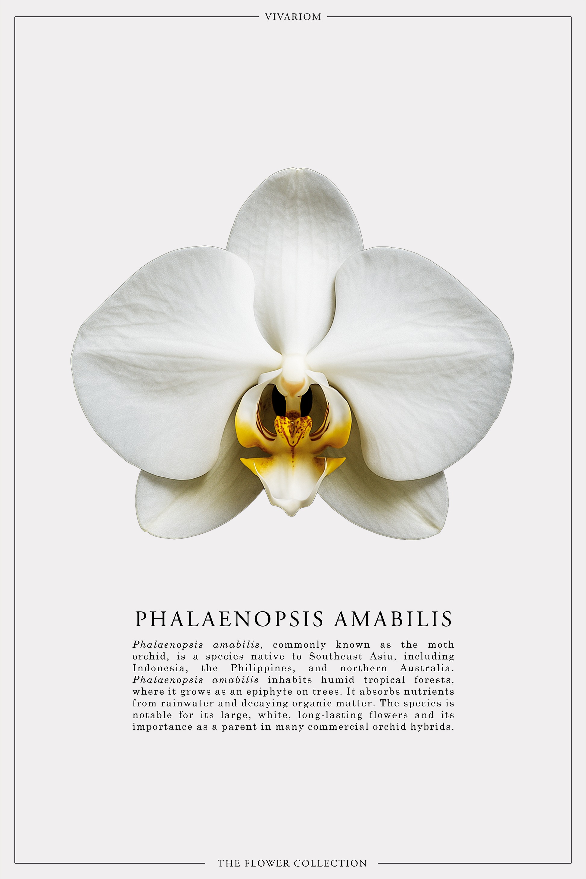 This encyclopedic matte art print presents Phalaenopsis amabilis, the Moth Orchid, as a refined naturalist plate, showcasing its snow-white blooms, golden lip, and enduring elegance. A unique piece for flower lovers, collectors of scientific illustration, and interiors seeking elegance with meaning.
