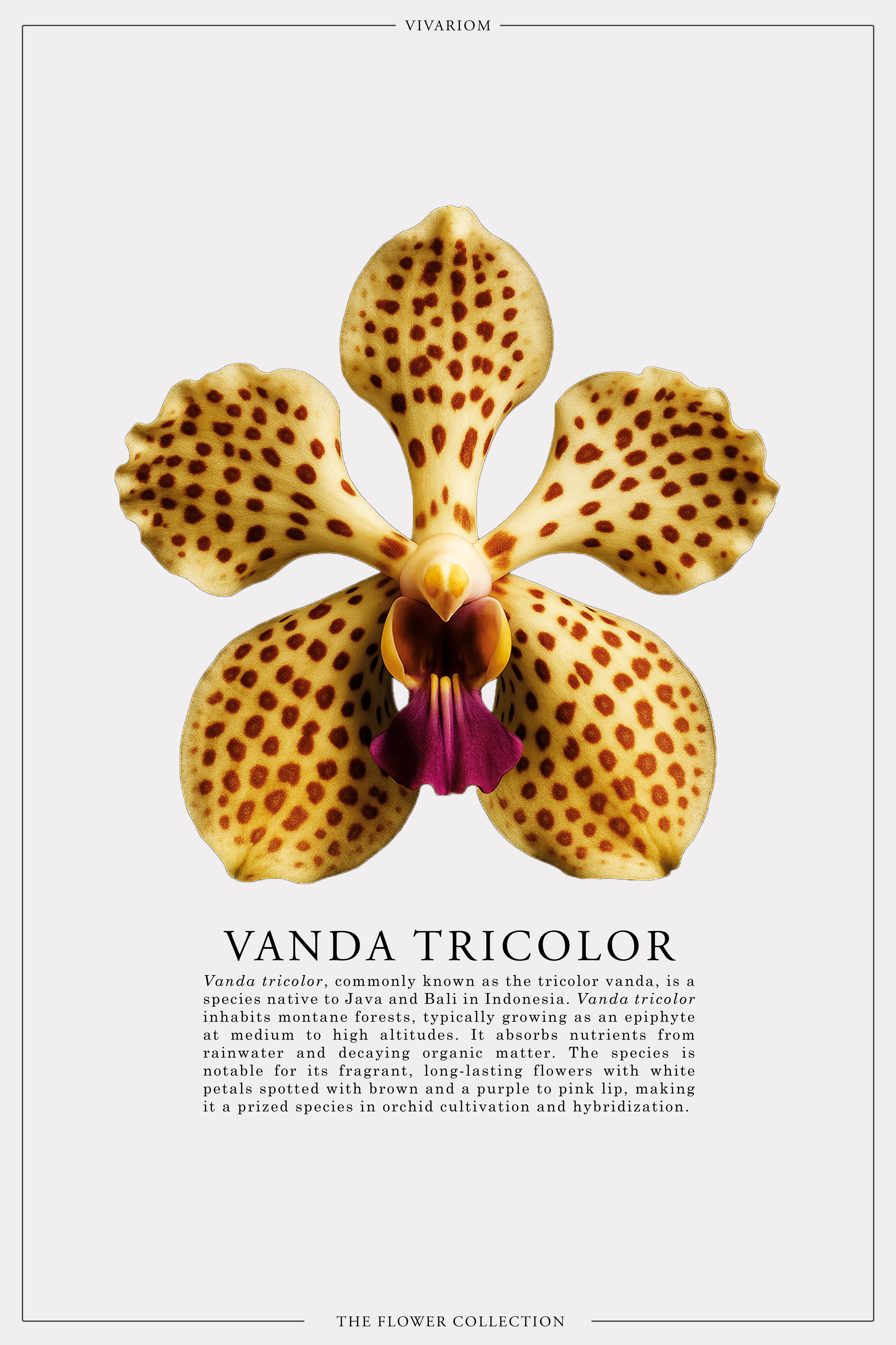 This encyclopedic matte art print presents Vanda tricolor, the Tricolor Vanda, as a refined naturalist plate, showcasing its creamy white petals marked with purple spots and a rose-colored lip. A unique piece for flower lovers, collectors of scientific illustration, and interiors seeking elegance with meaning.